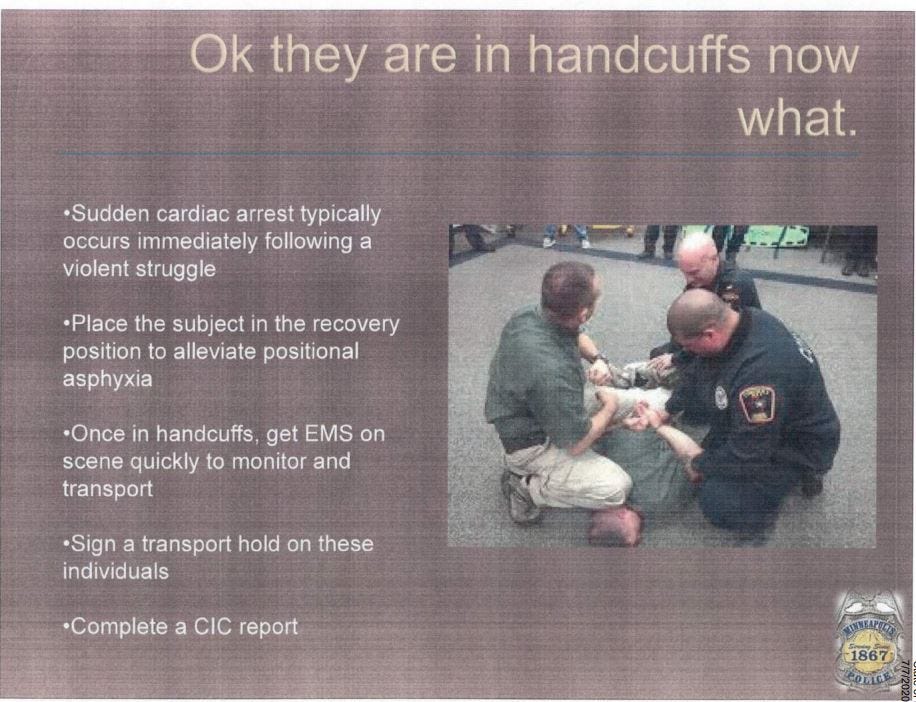 In August 2020, defense counsel made a motion to dismiss the charges against Chauvin. In the motion, they showed the photograph on top of the page. Referred to as BATES 2596, it was lifted from a PowerPoint presentation shown to MPD Officers during their formal training.